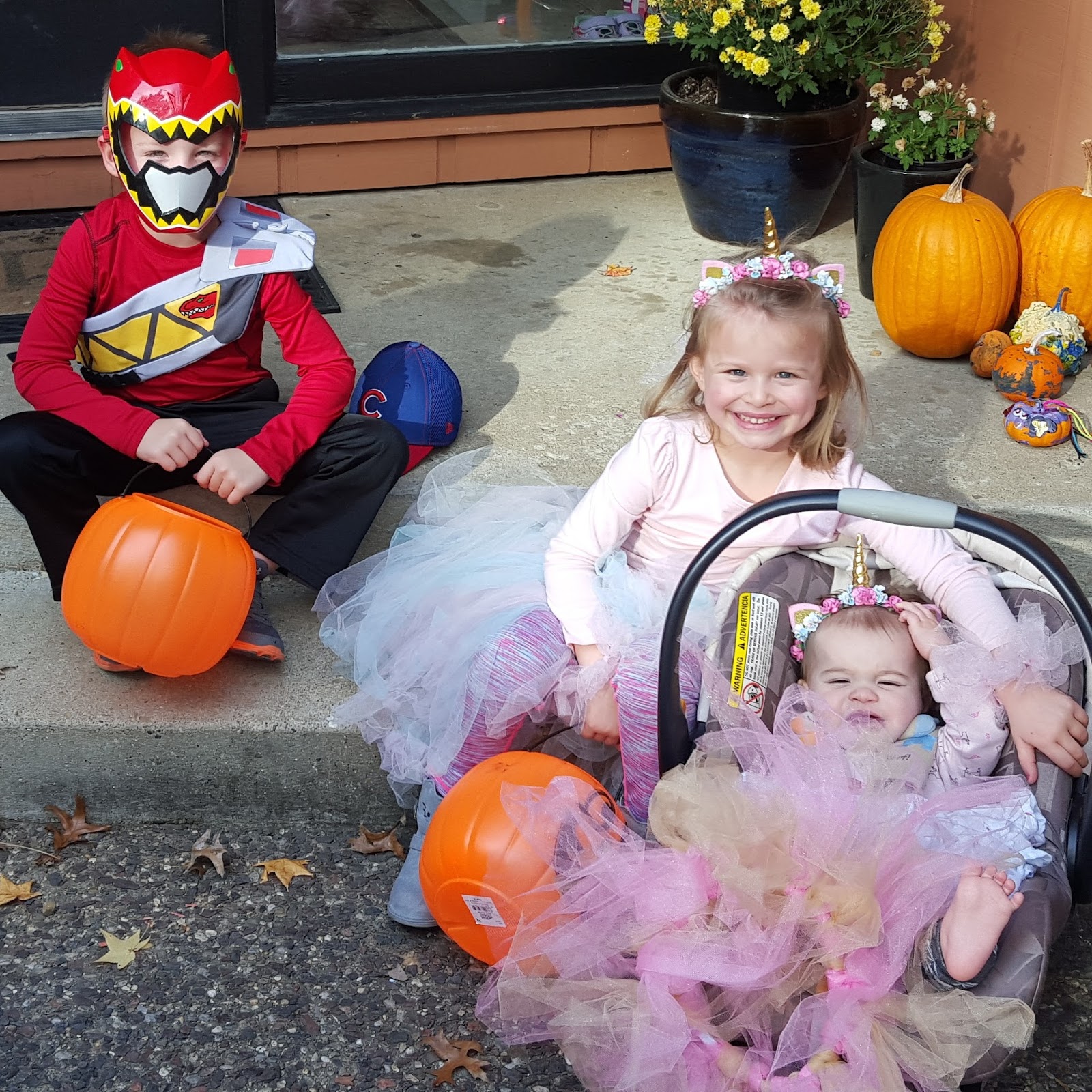 Door to door Halloween trick or treating with friends in our neighborhood.